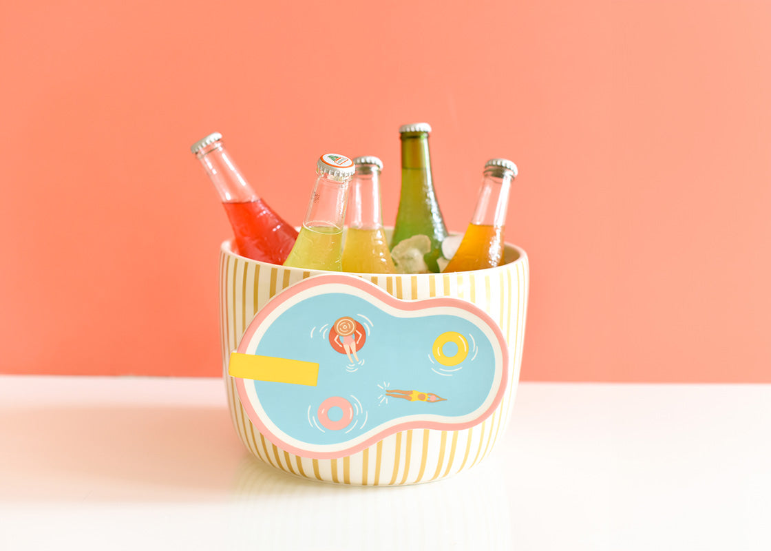 Bring a mid-century modern theme to your happy home décor with our Too Cool for Pool Big Attachment. This illustrated interchangeable design brings the best of the beach to a pool-side vision that is perfect for pool parties, bachelorette parties, and spring break! Attach to a Big Bowl filled with ice so you can rosé all day in Palm Springs style, or add the interchangeable décor to your favorite Big Platter to display sweet snacks or savory sandwiches.