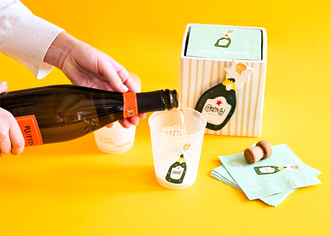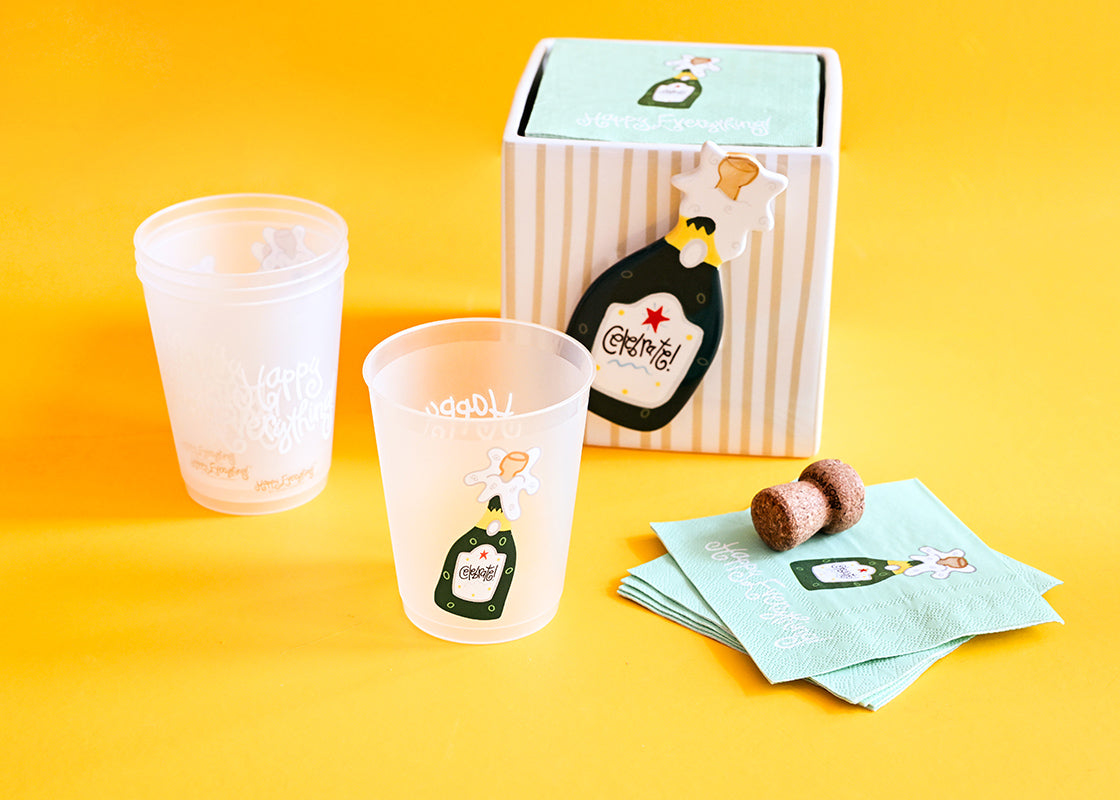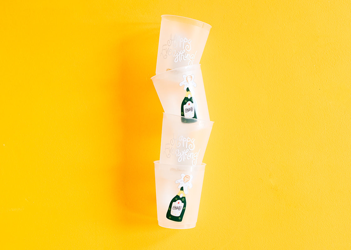 Made from a shatterproof reusable plastic, these frosted cups feature our signature Champagne bottle design and white Happy Everything! logo. Lightweight and stackable, this 10-piece set is easy to transport and store, making it the perfect party companion.