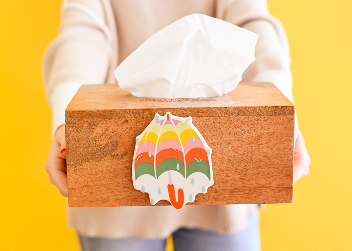 Rain, rain, go away, and bring happy back another day with our Drip Drop Umbrella Mini Attachment. When the weather gets dreary, interchangeable décor is the secret to adding cheer to your home. Attach this bright design to your Mini Tissue Box or Mini Platter and let the colors brighten up your inside while the grey sky looms outside.